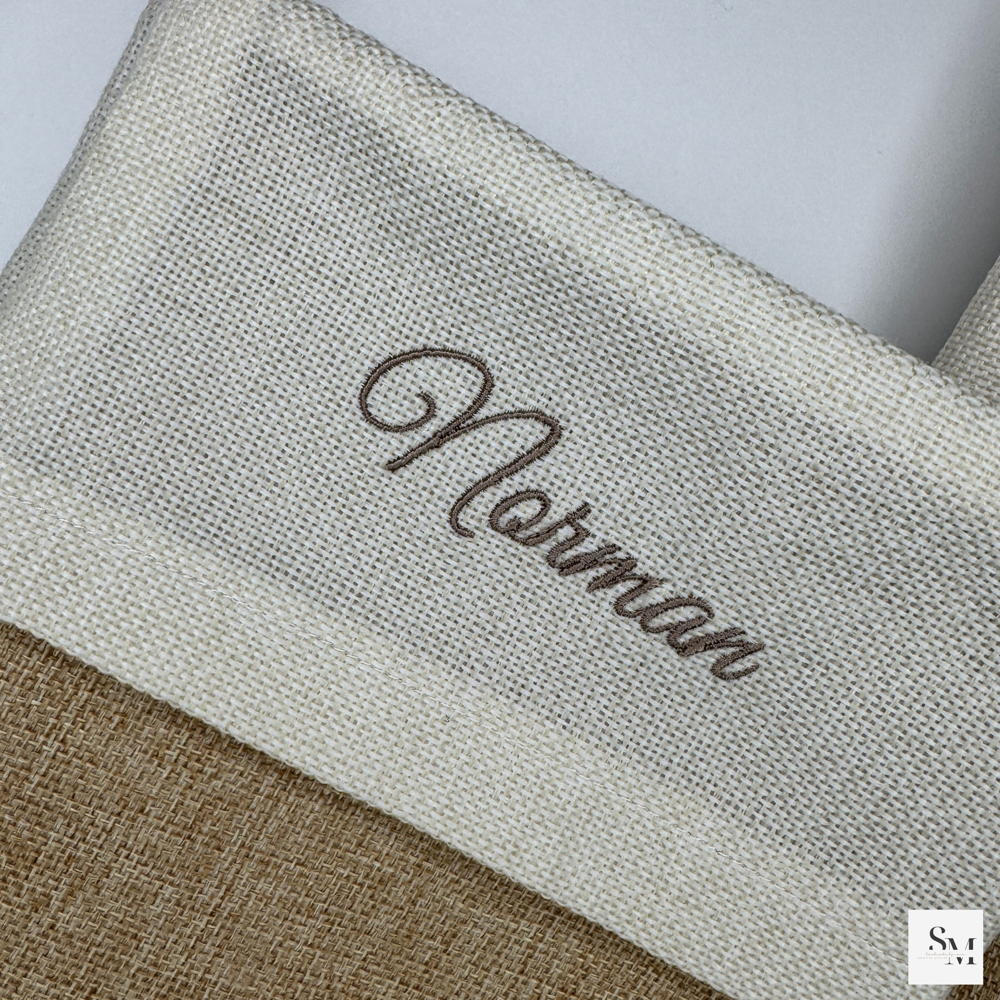 Jede Socke aus Sackleinen wird liebevoll personalisiert – dein Wunschname wird hochwertig eingestickt, nicht gedruckt! So entsteht ein einzigartiger, langlebiger und nachhaltiger Nikolausstiefel, der jedes Jahr wieder Freude bereitet.